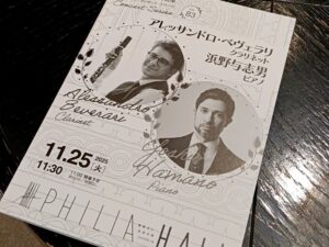 プロコフィエフのロメジュリはベヴェラリさんの編曲。演奏後にご自身で語られていたのですが、1年くらいかけて編曲したそうです。凄かったわ、高速パッセージや迫力あるパワフルなパートもあり、テクニックでも魅せるし原曲の良さもギュッと詰まっていて、何より吹いているご本人がすごく楽しそう。さすが自分で編曲してるだけはある。持ち替えもしていました。AとCかな、わからないけど、AとB♭よりは2本のサイズ差が大きかったような。E♭ほどではないと思うけど。ともかく、クラリネットで演奏するのがとてもよく似合うような編曲でした。でも演奏後は「いつもはピットで吹いている、バレエは劇場で見て」と言っていたのも東フィルの方だなって感じで良かったです(笑) アンコールについては「フランスの音楽をやったので、アンコールはサン=サーンス、楽譜があっちにあるので15分、ああ、15秒待ってください」と。楽譜を取りに行っている間に、浜野さんが「このデュオは4年くらいやっているが、出会いは親友のコハーン・イシュトヴァーンを通して。今日コハーンも来てます」と客席を指しました。僕の席からはわかりませんでしたが、コハーンも来ていたとは。今回のプログラムに相応しい、良い終わり方のアンコール。大満足でした。