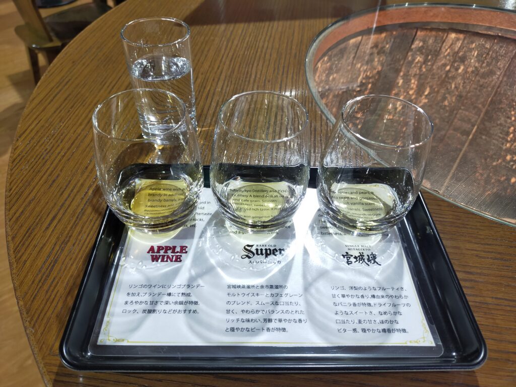 50分ほど蒸留所内を練り歩き、しっかり見て解説を聞いて、それから頂く試飲が良いのだ。試飲は3種。まずは、これがなくてはお話にならないシングルモルト宮城峡と、ニッカの顔とも言えるスーパーニッカ、そして歴史あるアップルワイン。ニッカは日果、大日本果汁株式会社が元ですからね。もちろんどれも美味しかったし、お酒はもちろん、新川の天然水も良かった。この水がものすごくうまくてビビる。そりゃ良いお酒出来ますわ。チェイサーでも割り水でもぜひどうぞと言われて。悩みましたが、チェイサーにしかしませんでした。いやほら、試飲、おかわりできるなら次は割るけど、一応最初はストレートでいくでしょう。仕方ないね。でも割ってみたかったなあ。というか、時間がなくてね。この段階で10時15分くらいなんですよ。作並駅に戻るシャトルバスが10時30分発で、それに乗らないと次が11時30分なんです。お昼食べる時間とか、あと仙台駅から地下鉄でホールのある泉中央駅に移動する時間とか考えると、ここで1時間の余裕はない。試飲コーナーのすぐ横がギフトショップで助かった。3種の試飲をしっかりと味わい、新川の美味しい水も味わい、超スピードでお土産を購入し、駆け足でバス乗り場へ。美味しいウイスキー飲んですぐ小走りしている自分が面白くて、なんかいい。宮城峡のエキスを速攻で全身に回している感覚だ。僕は何をしているんだろう……(笑)